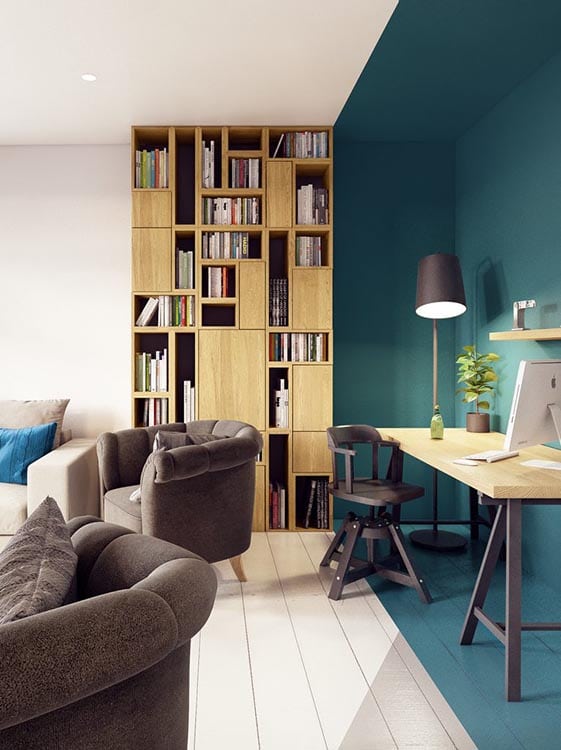 Pourquoi ne pas créer des espaces visuellement distincts avec des zones de couleurs délimitées pour le coin à coup de fil, ou alors pour le coin « inspiration/respiration »… Ici dans un appartement on a délimité l’espace bureau (mais le bureau est face au mur… bouh!!!). Je trouve que c’est une excellente idée si votre bureau est dans un espace commun à votre vie de famille ! Inconsciemment vous limitez l’espace de travail à cette zone ! … Donc en dehors de cette zone, vous n’êtes pas au boulot 😉 !!!