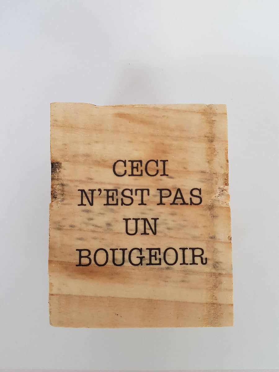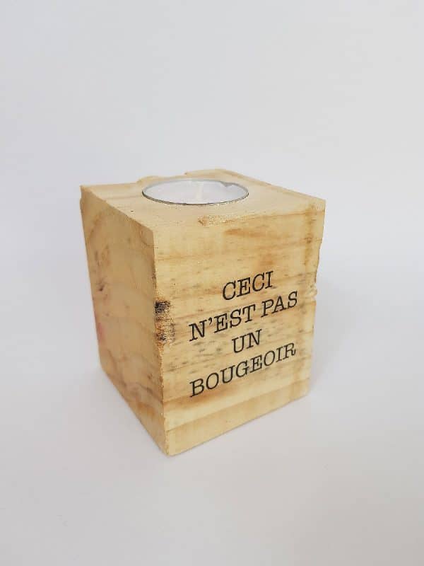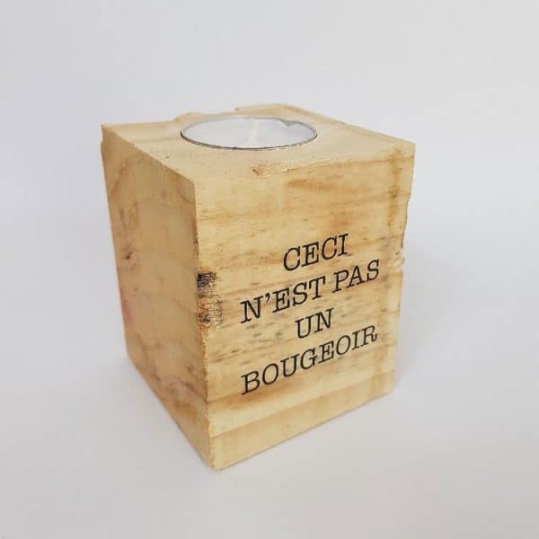 Voici un cube de palette, transformé en bougeoir spécial pour bougie chauffe-plat. Le motif Ceci n’est pas un bougeoir est présent sur deux faces, d’un côté avec le texte, et de l’autre, le texte accompagné d’un dessin d’une flèche. Un clin d’oeil à l’art absurde du début du 20ème siècle et plus particulièrement à Magritte.