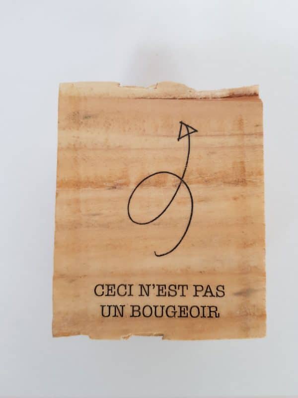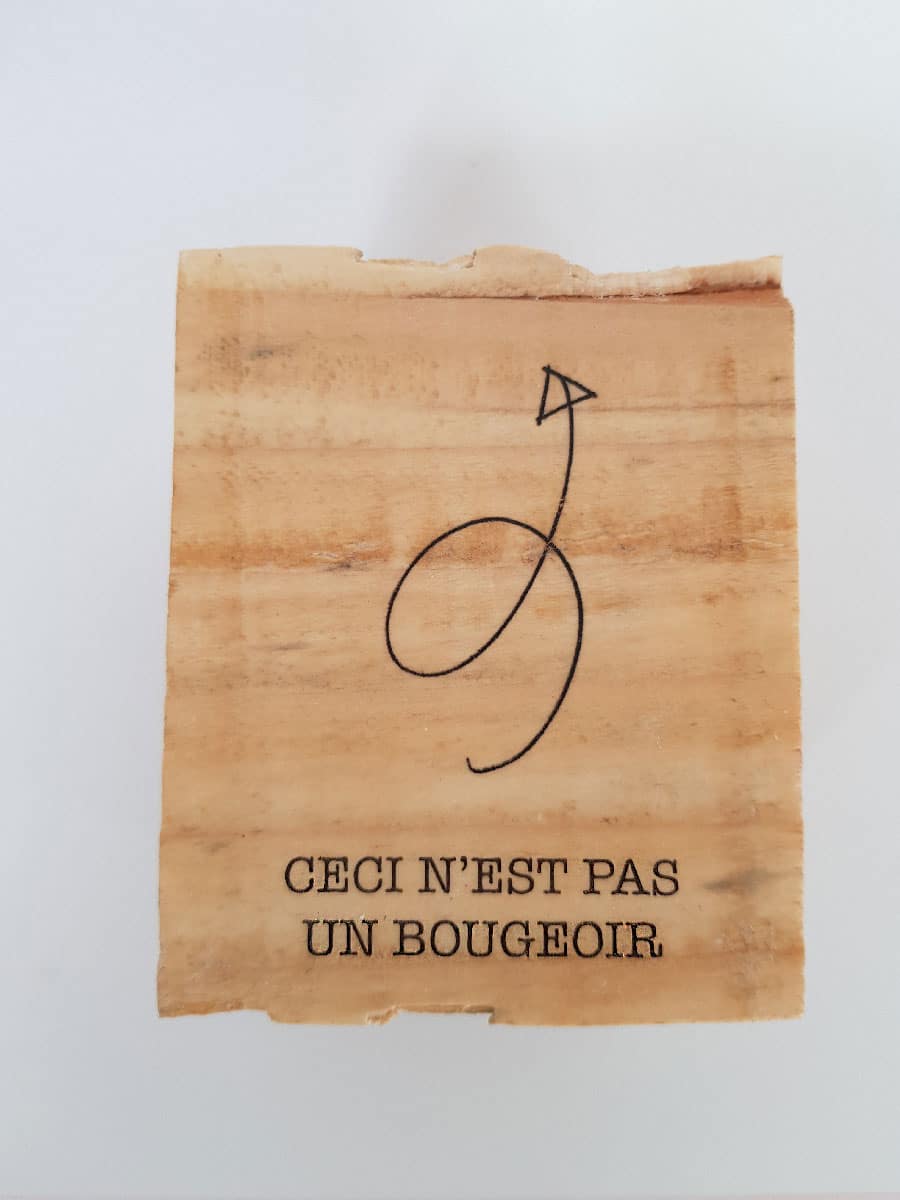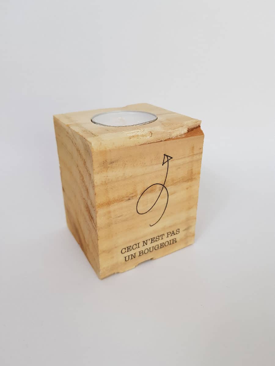 Au départ, un cube de palette, transformé en bougeoir spécial pour bougie chauffe-plat. Le graphisme « Ceci n’est pas un bougeoir » est présent sur deux faces, d’un côté avec le texte, et de l’autre, le texte accompagné d’un dessin d’une flèche.