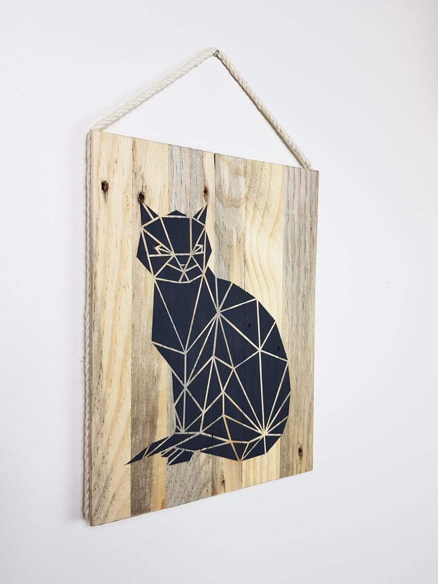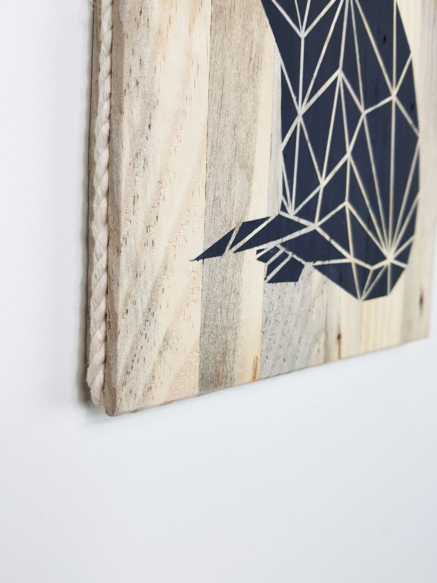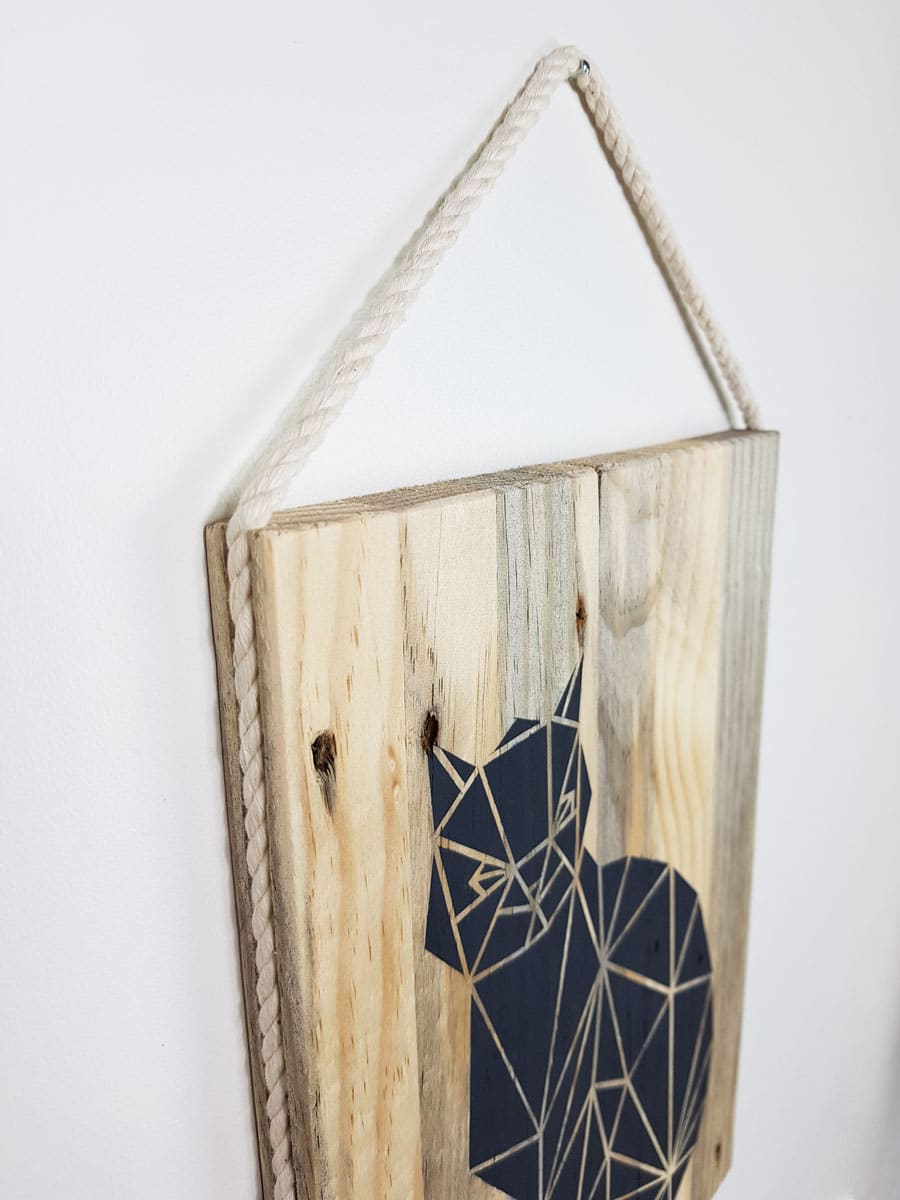 C’est quoi un tableau palette origami by Jaune Hirondelle ? C’est un tableau réalisé à partir de planches de palettes récupérées, présentant un motif façon origami avec sa suspension en corde de coton macramé.