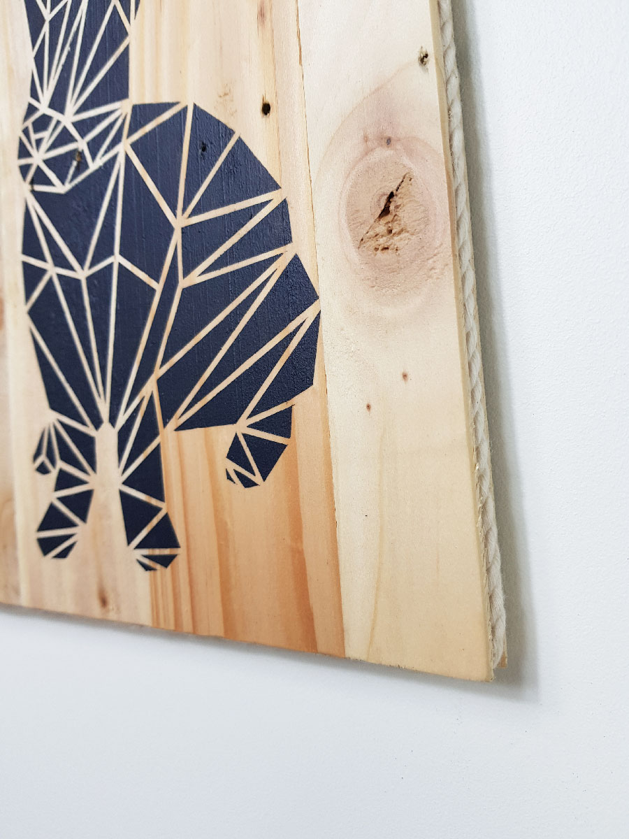 C’est quoi un tableau palette origami by Jaune Hirondelle ? C’est un tableau réalisé à partir de planches de palettes récupérées, présentant un motif façon origami suggérant un animal avec sa suspension en corde de coton macramé.